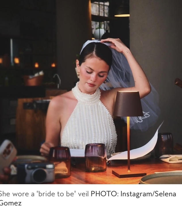 Well, Selena Gomez is getting married, and she went to the beach in Cabo for her bachelorette party with a few of her best friends. The following pictures are of Selena, a vision in all white attire. She poses for the camera in white bikinis and white dresses, wearing a short veil. The bachelorette party was very nice indeed.