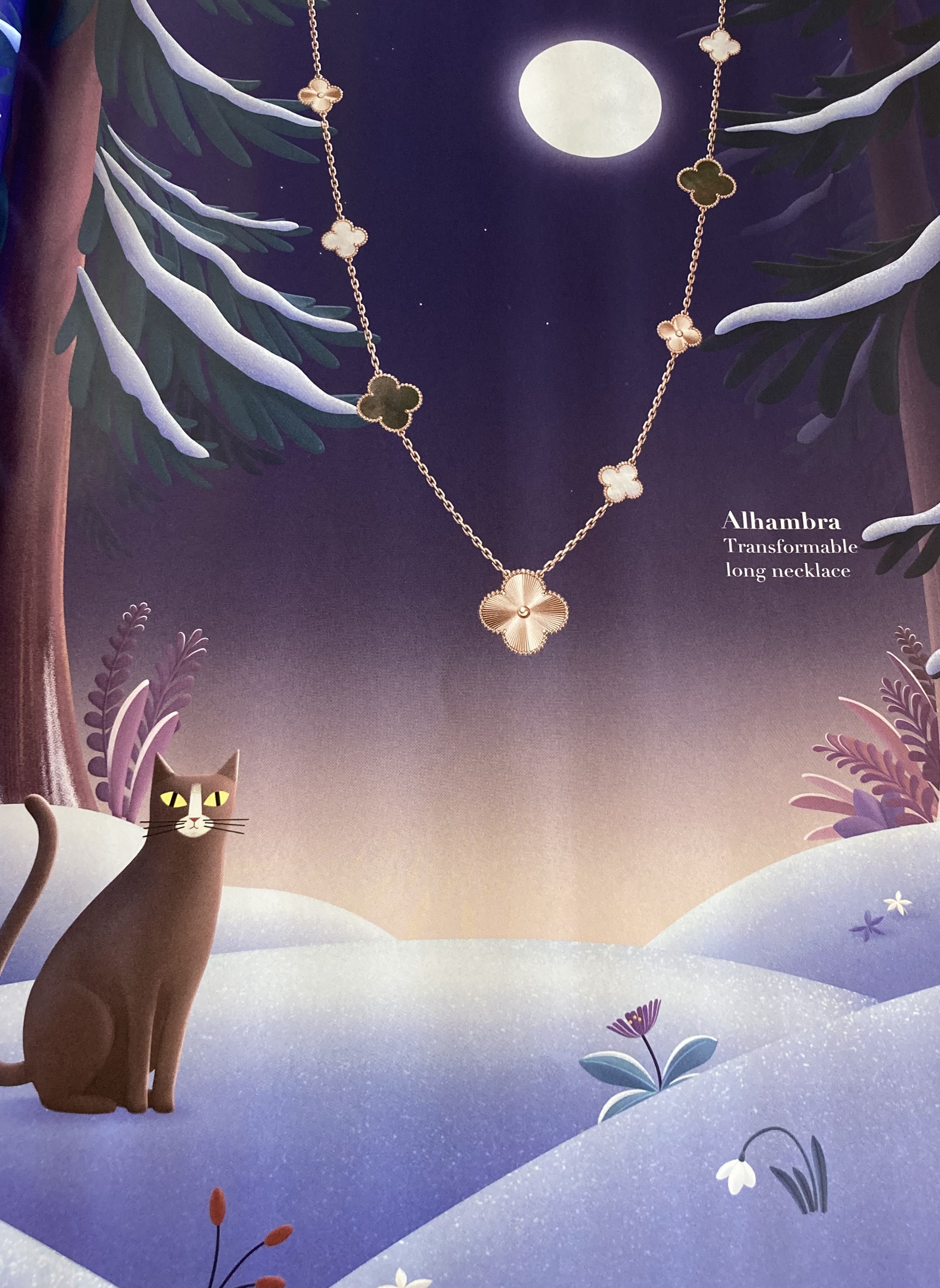 New Van Cleef and Arpels Jewelry The Transformable Necklace. Well, it seems like Van Cleef has done it again. The ever popular Alhambra bracelet and necklace have been upgraded, and it looks a bit different from usual. The necklace has been transformed into a more striking design that has the clovers more spaced out instead of close together as it was before, and the bracelet is the same but uses different, more sophisticated stones.